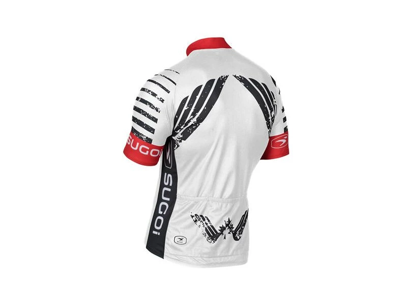 Weißes Sugoi Flight Radtrikot mit schwarzem Ahornblatt, Streifen an den Ärmeln sowie rot abgesetzten Bündchen.